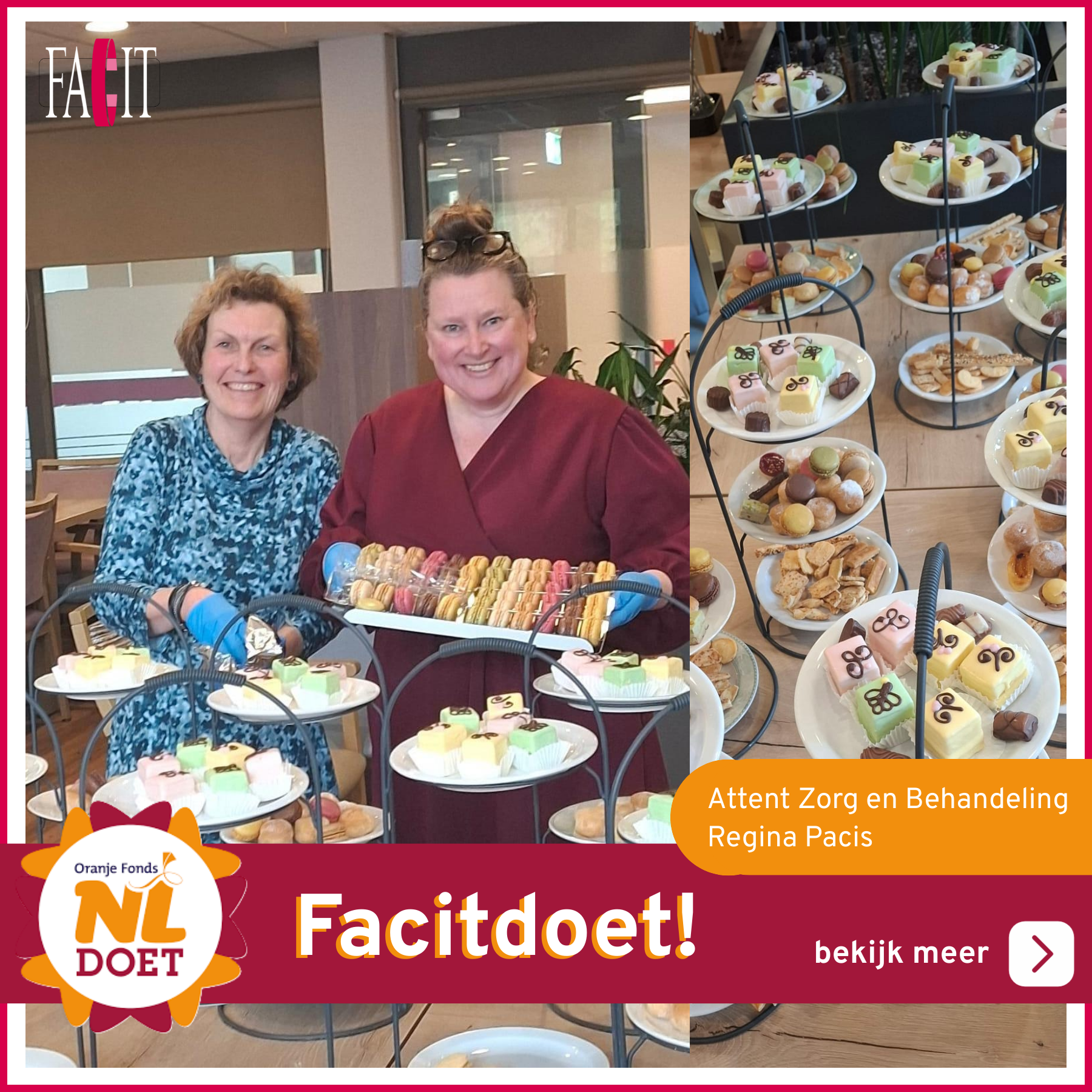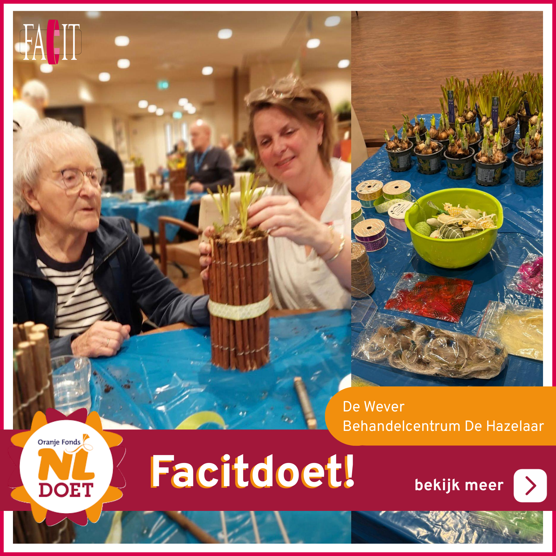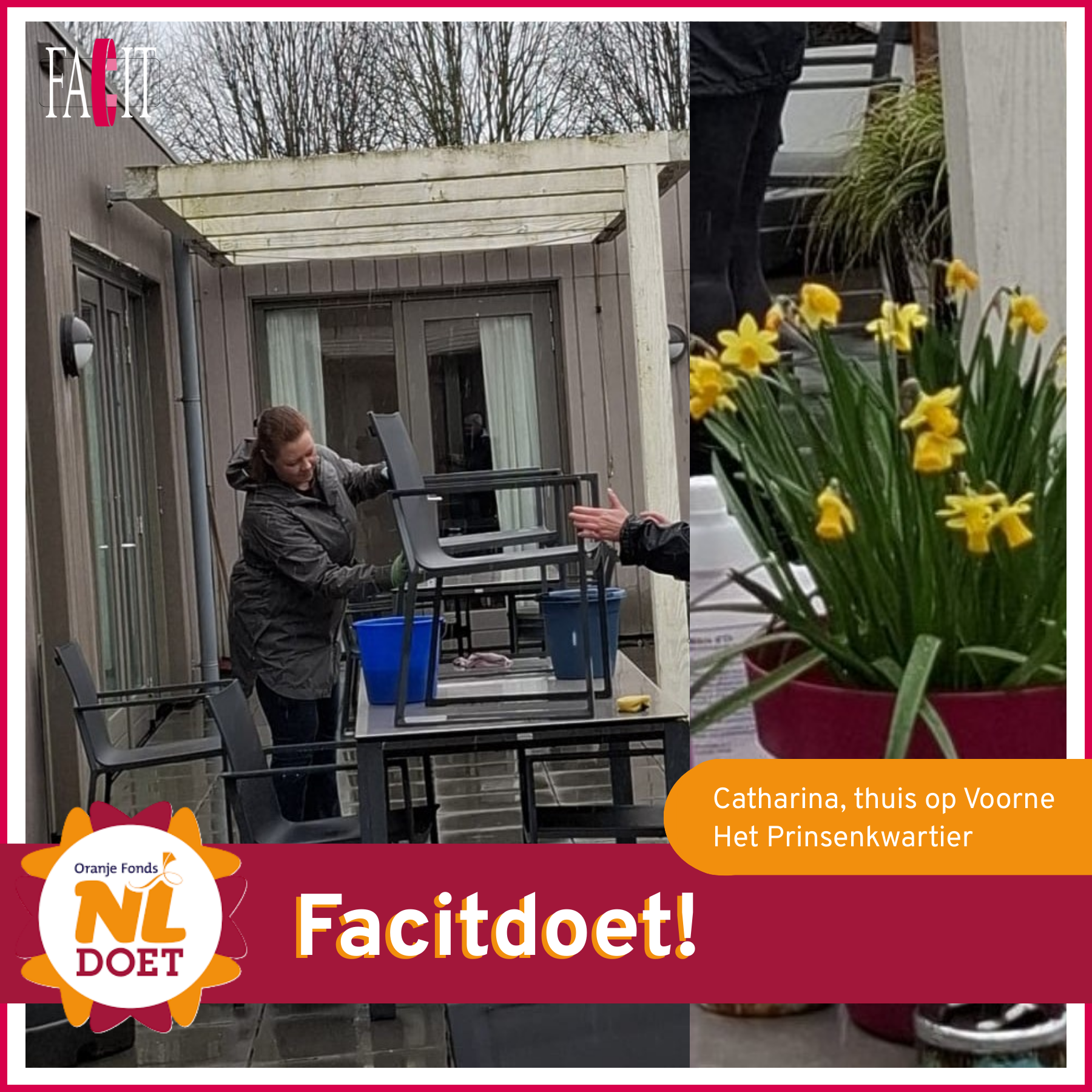 Afgelopen twee weken hebben een aantal collega’s weer meegedaan aan NLdoet, onze jaarlijkse traditie om bij een Facitklant iets anders te doen dan kwaliteitsondersteuning, een onderzoek of een training. In de tuin werken, een high tea voorbereiden, voorjaarstukjes maken en het schoonmaken van tuinmeubels, onze collega’s kunnen het! Dit jaar waren we welkom bij Thomashuis De Zaanse Akker, Attent Zorg en Behandeling, De Wever en Catharina, thuis op Voorne, dank voor de gezelligheid!